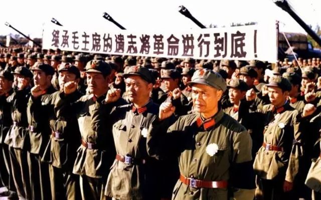 1976年9月,黑龙江某军在珍宝岛战斗英雄冷鹏飞(前排右1)军长带领下沉痛悼念毛泽东逝世。