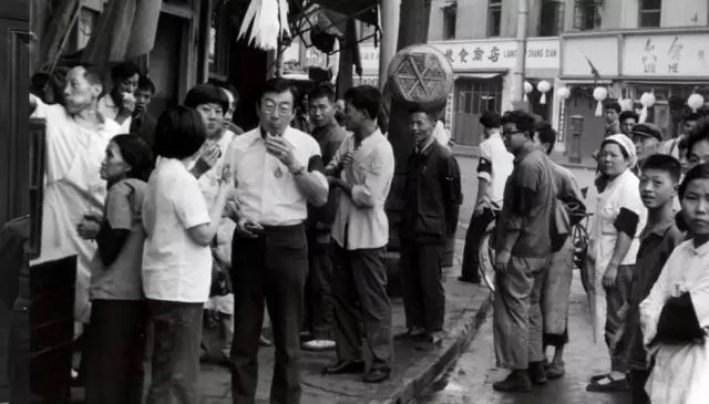 1976年,毛泽东逝世后不久,上海一个早点摊上,市民身穿白衣素服,臂戴黑纱。