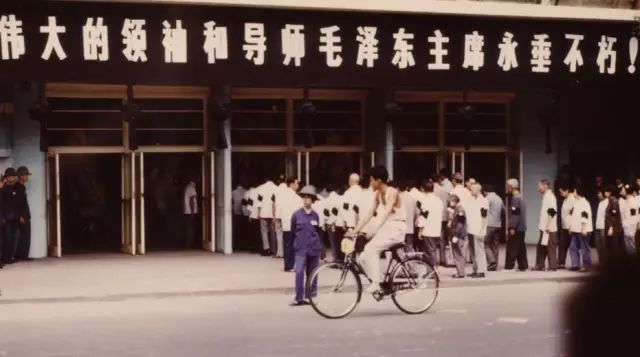 1976年9月,上海一处剧场挂上标语哀悼毛泽东,市民戴黑纱秩序进入场内。