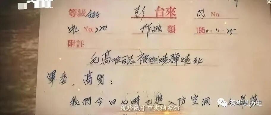 在电报中是这样说的“我们今日七时已进入防空洞,毛岸英同三个参谋在房子内,十一时,敌机四架经过时他们四人已出来,敌机过后他们四人返回房子内,忽又来敌机四架,投下近百枚燃烧弹,命中房子,当时有二名参谋跑出,毛岸英及高瑞欣未及跑出被烧死,其他无损失。”