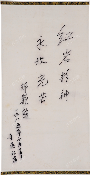 邓颖超在离开红岩时答应重庆党史办同志的请求,为红岩题字。她写下“红岩精神 永放光芒”,落下“邓颖超”三个字之后,驻笔沉思。她旁边的秘书赵炜悄声说:“于红岩。”邓颖超摇了摇头,终于郑重落墨,写下“重返红岩”几字。
