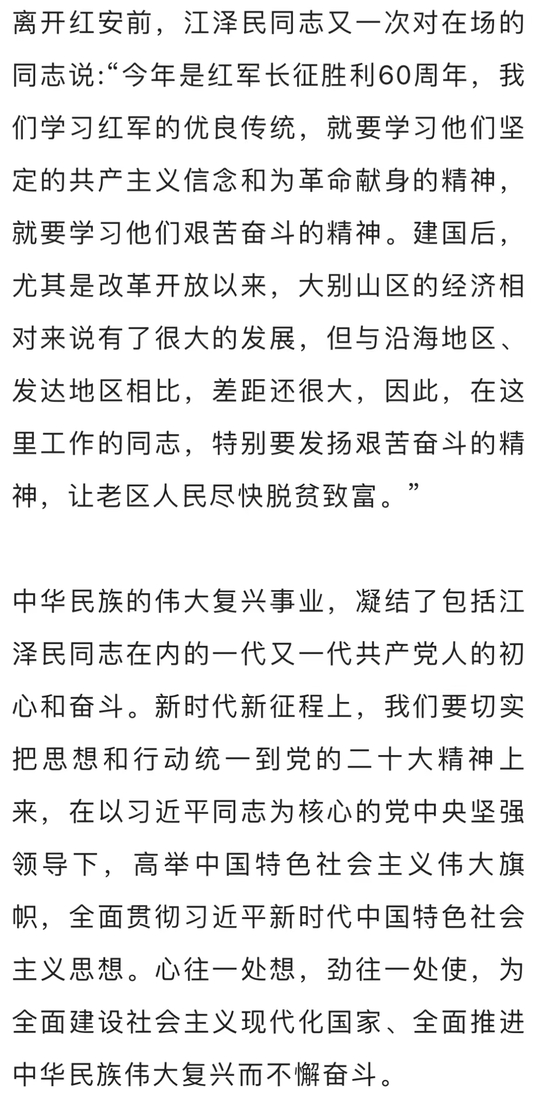 1996年9月18日,时任中共中央总书记、国家主席、中央军委主席江泽民同志带领中央部分领导来到将军县红安视察。给老区红安人民以极大的鼓舞。二十六年后的今日,这位令人尊敬的长者永远地离开了我们,但他的音容笑貌却永远留在了老区人民的心中……