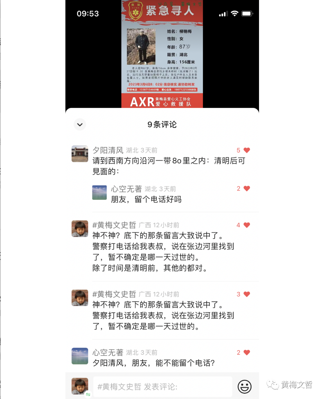 直至昨天(2023年4月3日),黄梅警方打电话给我表叔,说在苦竹乡张边(黄梅话读音,具体字不知道该怎样写,地图上没显示这个屯哈)屯哈河里发现了老人的遗体。