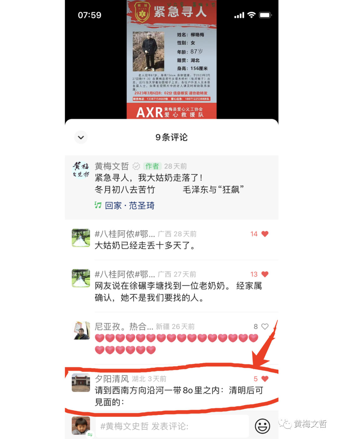 令人诧异的是,三天前(2023年4月1日)有一位名叫“夕阳清风”的湖北网友在视频底下留言“请到西南方向沿河一带8o里之内:清明后可見面的”。
