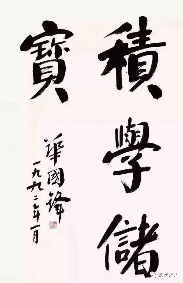 在凤凰卫视一档栏目中,看到关于华国锋同志晚年生活的介绍,在他的书房中挂着一张书法作品,是其85岁时所写的“清静”两个带有颜体意味的行书,书法敦厚凝重,展现出深厚的功夫。