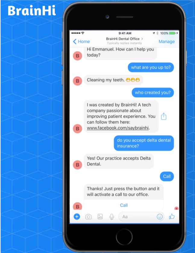 是一家来自波多黎各的 AI 创业公司,为医疗健康诊所提供虚拟前台(聊天机器人 chatbot)服务,可 24/7 在线为患者解决与医疗不相关的其他问题,例如支付、保险、预约等等。BrainHi 的自动化虚拟前台可以嵌入到医疗诊所的Facebook 页面、官网、电话系统中,帮助医疗诊所减轻前台值班人员的负担,降低病患电话的遗漏率,并且与潜在病患在治疗前开展对话。