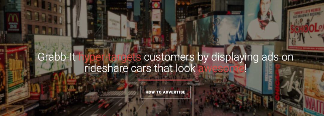 新一代的广告媒介平台,Grabb-it 可以将广告投放在车窗户上。广告投放者可以根据想吸引的人群可能出现的地点有目的性的选择投放广告的地理位置,并且可以自由地选择市场 campaign 的周期、长短等等。任何人都可以在 Grabb-It 的平台上申请让自己的车子成为广告媒介的载体,Grabb-It 会上门将硬件软件免费安装在车窗户上,车主可以根据承接的广告量获取额外的收入。