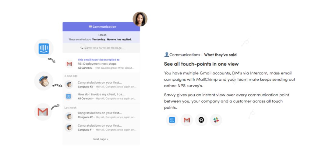 Savvy 旨在将多个平台上与人互动的信息清晰地整合在一起,并进行分类,同时以 Google plugin 的形式一键展示给用户。现可整合的平台包括 intercom、mailchimp、邮箱、salesforce、slack、google drive 等。