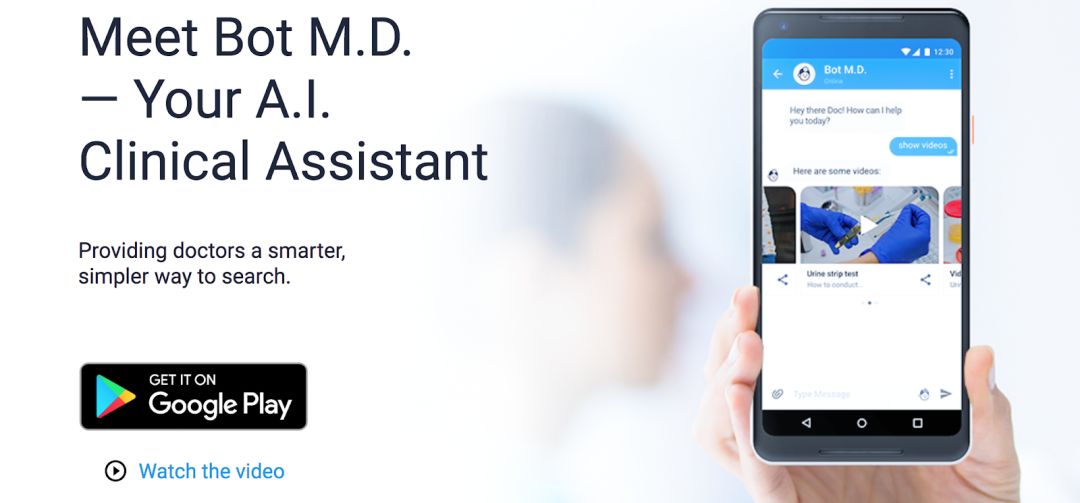 服务于医生的人工智能医疗助理。医生可下载 Bot M.D. 手机 APP,向其询问关于药物、 疾病及病情案例等信息,降低医生检索医学资料的难度,提高工作效率。Bot M.D.自带翻译功能,可自动将外文文献翻译为用户的母语。