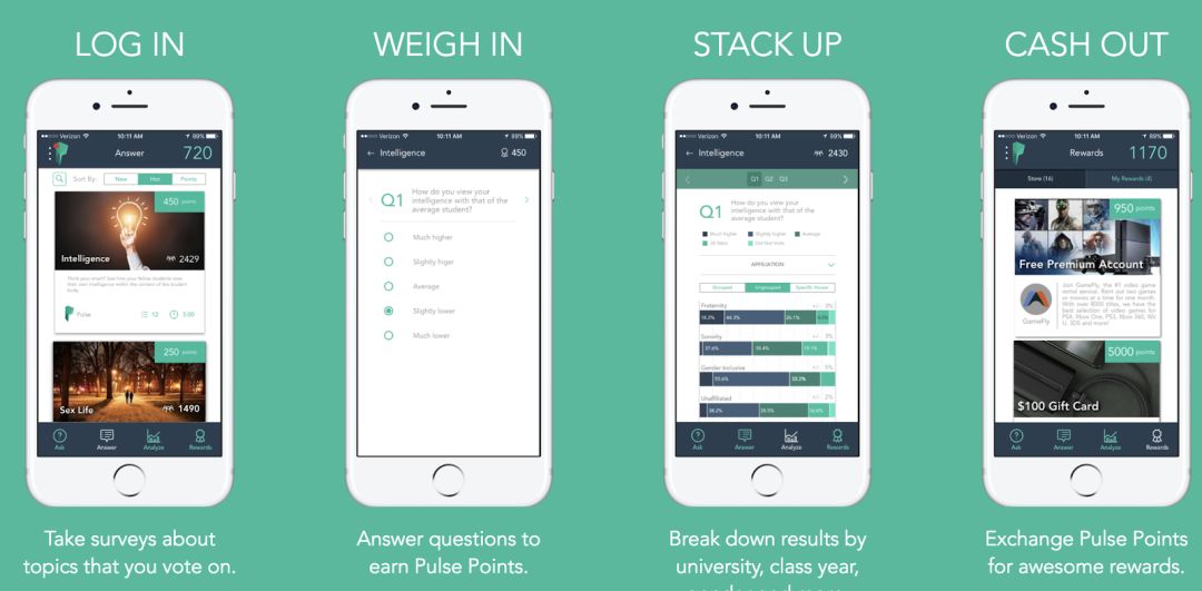围绕问题投票场景建立的大学生社交软件,投票问题涉及政治、媒体、枪械控制、性骚 扰、饮酒、女权、假新闻、心理健康、大X等方面。用户登录后可选择感兴趣的话题填写问卷调查,每完成一份问卷会得到不同的分数,当分数累积到一定程度时可兑换现金或礼 物奖励。College Pulse 希望通过问题投票形式,加深大学生们对彼此人生观、价值观和 世界观的了解,消除信息不对称和误解。