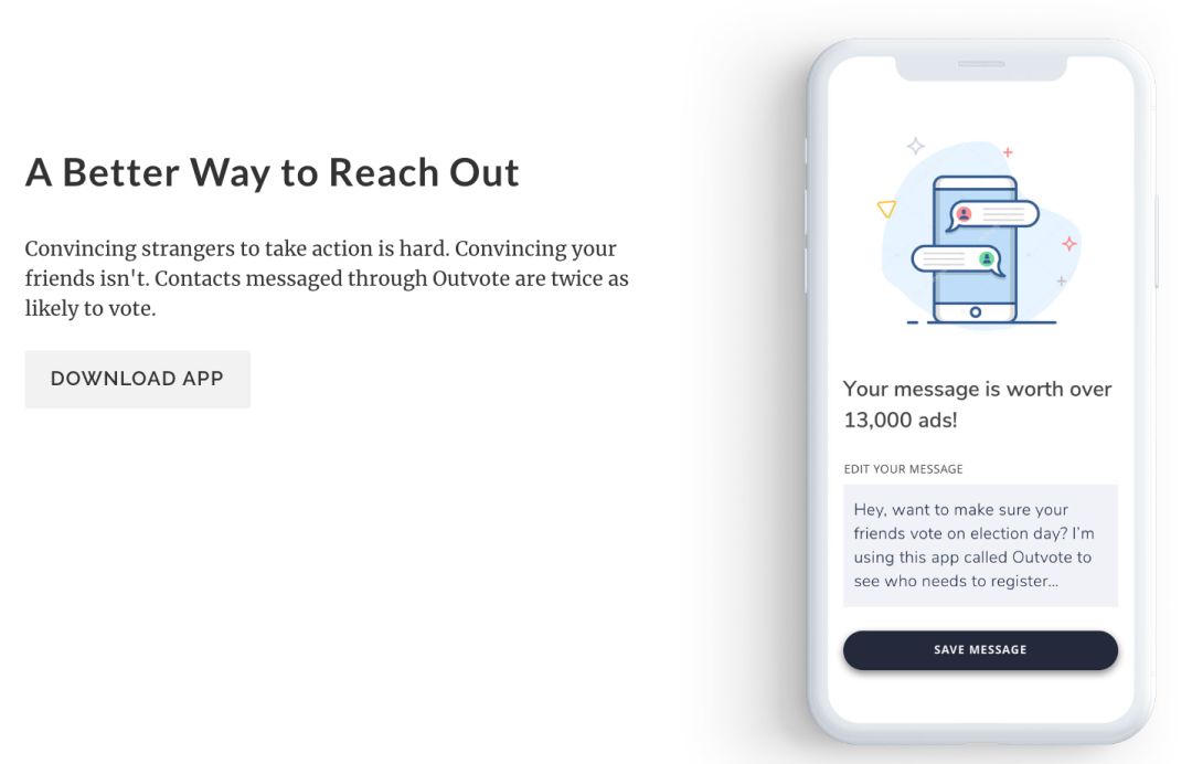 提高人们政X投票参与度的社交 APP。由政治竞选团队主导的广告宣传很难说服人们参与投票,人们更喜欢通过推特、Facebook 等社交媒体讨论自己的政治观点,Outvote APP 希望利用人们社交圈的影响力,通过让用户发送投票提示信息给有投票权却还未投票的朋友,提高全社会的政治竞选参与度。据统计,Outvote 将千禧一代的投票参与度放大两倍,其他年龄段的投票可能性增加 50% 。