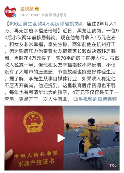 “曾在杭州工作的90后两年前移居鹤岗,4万元全款买房”