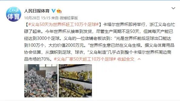 这句话并不是传说。前几天,一则“义乌50天为世界杯赶工10万个足球”新闻登上了热搜。