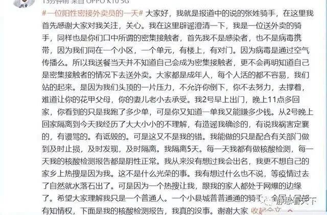 网上有人夸我,也有人骂我。有人半夜三更打我电话、加我微信。有人传我是阳性病例,甚至有人说,“你都新冠了还跑单。”开始我比较生气,后来看到不少网友都在关心我,说实话,我挺感动的。