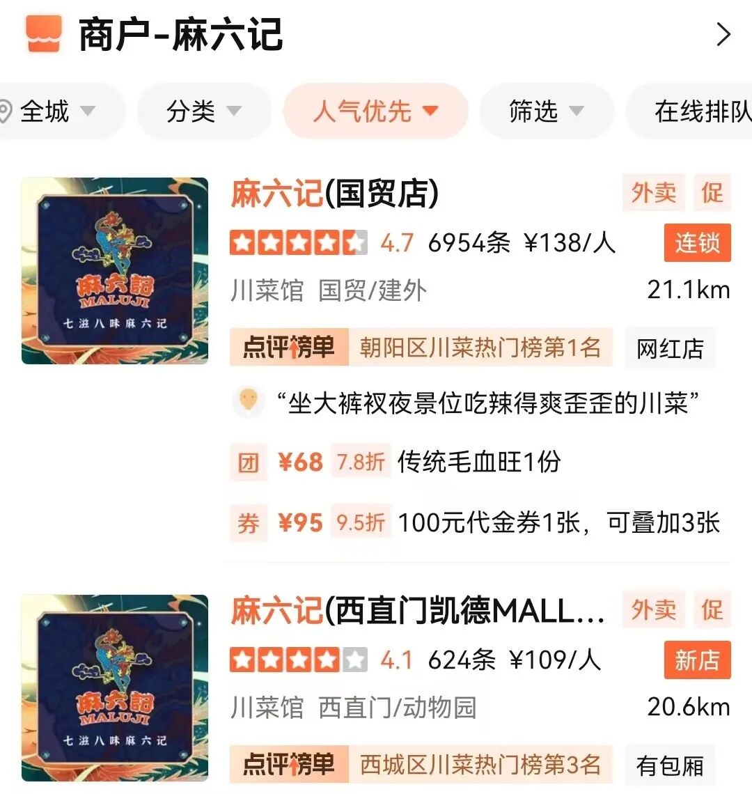 据麻六记公众号,品牌主打传统川菜,主打菜品包括毛血旺、辣子鸡、水煮鱼等。11月23日,大众点评显示,麻六记客单价在100元上下。