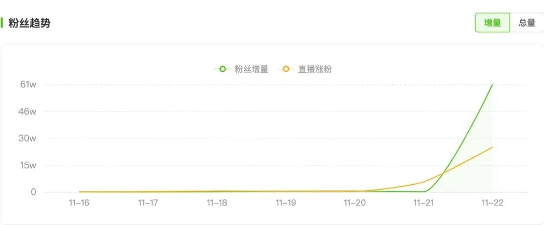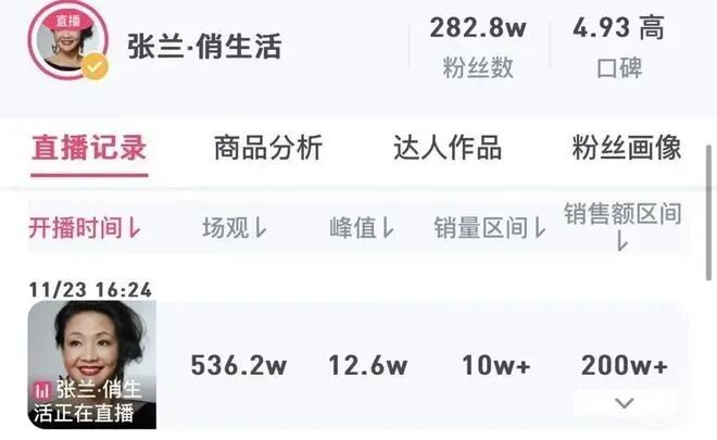 飞瓜数据显示,仅11月22日当天,“张兰·俏生活”直播间观看人次达到了1632.1万,直播涨粉25.4万,日涨粉60.8万。