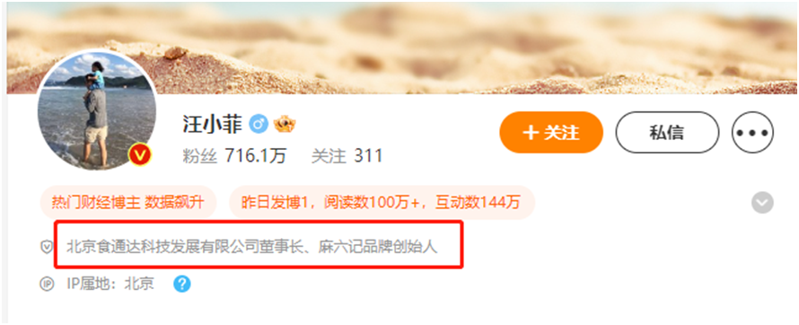 “北京食通达科技发展有限公司董事长、麻六记品牌创始人”是汪小菲的微博简介。