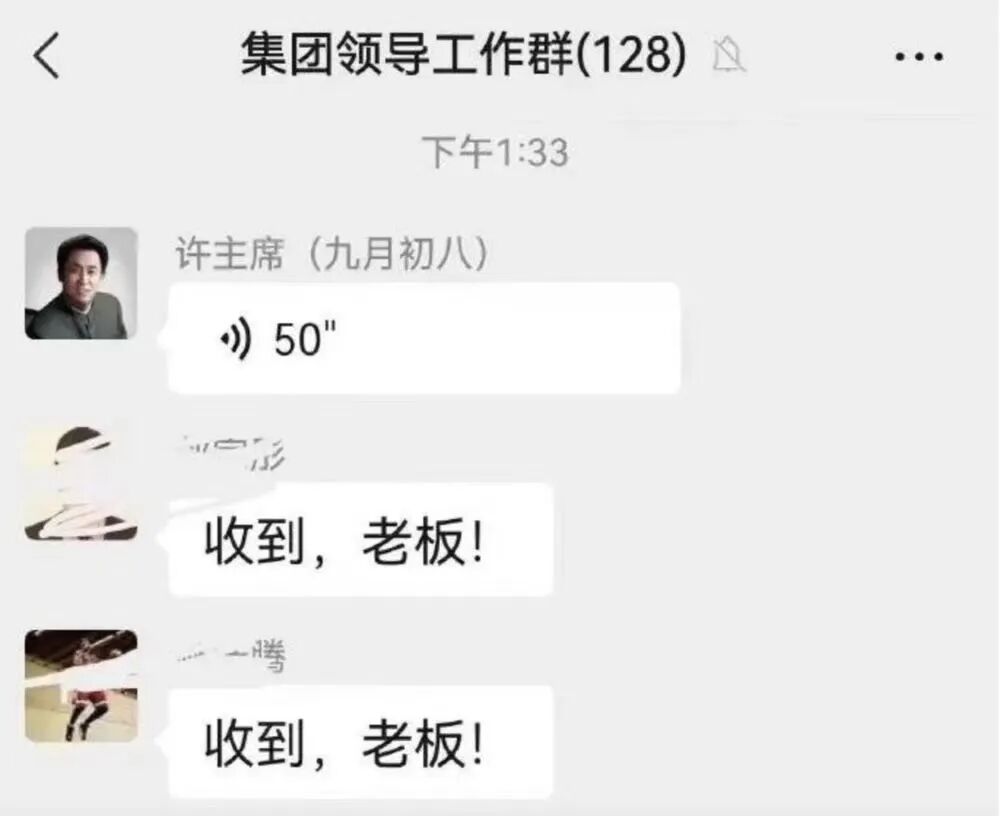 当日下午一点多,许家印在恒大集团大佬群的50秒语音截图被刻意放出。