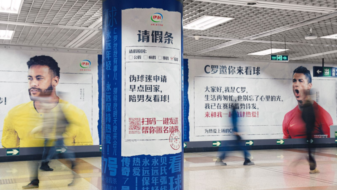 像是前期蓄力的热搜#00后球迷为看球让内马尔帮忙请假#,背后是伊利安排的明星帮你请假看球赛活动,以内马尔帮忙请假、C罗和贝克汉姆邀你看球为引子,与徘徊在生活和工作之间的打工人有了走心的入口。