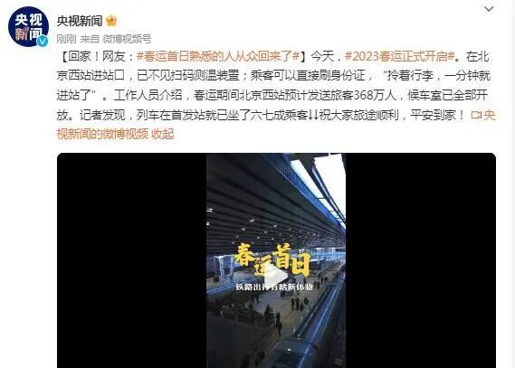 根据官方初步分析研判,2023年春运期间客流总量约为20.95亿人次,比去年同期增长99.5%,恢复到2019年同期的70.3%,创下近几年新高。