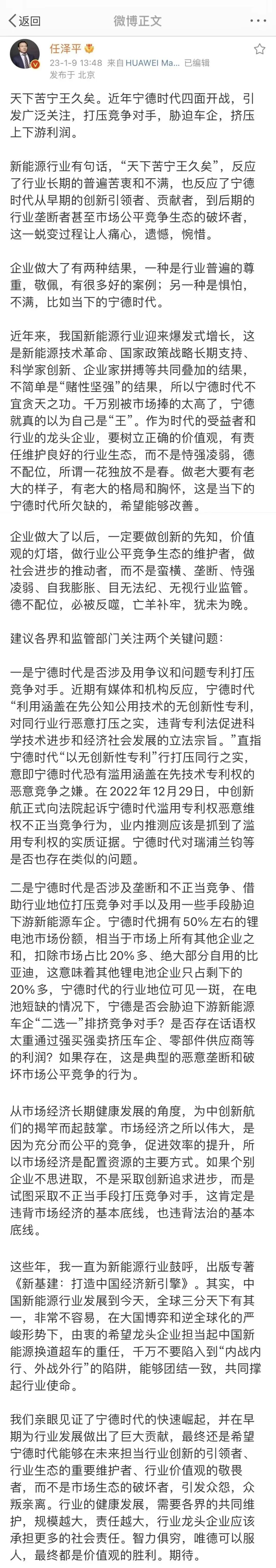 1月9日下午,著名经济学家任泽平突然在微博发文炮轰宁德时代,文章的题目标题是:“天下苦宁德时代久矣 为中创新航们的揭竿而起鼓掌”。