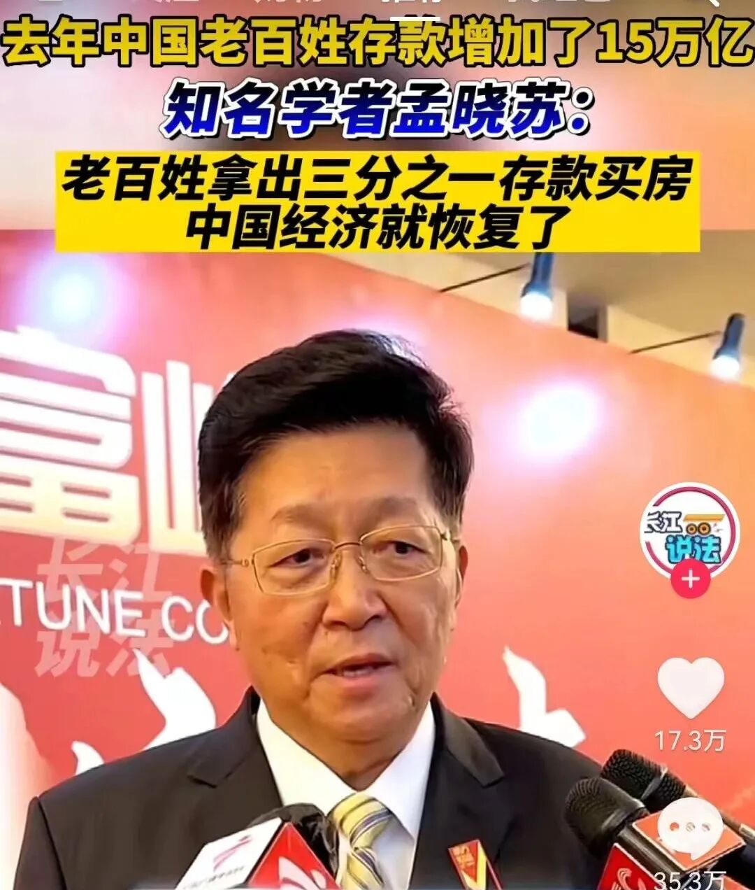 他在接受采访时表示:百姓拿出三分之一的存款买房,这样可以快速复苏萎靡的经济。