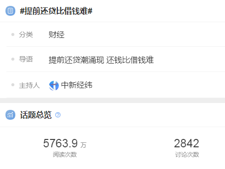 “提前还贷比借钱难”登上热搜后,相关话题阅读量瞬间突破了5000万。