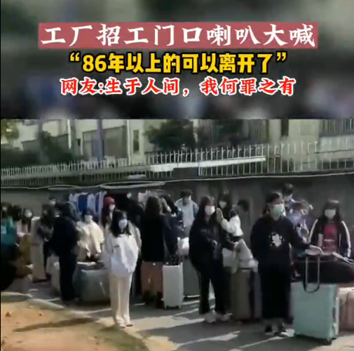 一工厂门口招工,人们挤在一起排着队,突然一个大喇叭响了起来:“86年以上的后可以走了。”