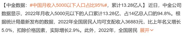 中国2022年月收入5000元以下的人口累计13.28亿,占14亿总人口的94.8%。