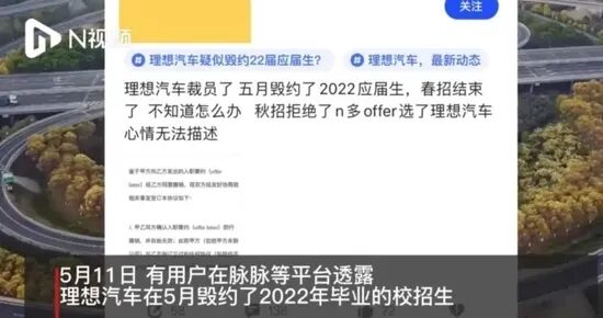 5月11日,有用户在脉脉等平台透露,新能源汽车巨头理想汽车因近期对业务架构进行调整,部分2022年毕业的校招生面临解约的情况。