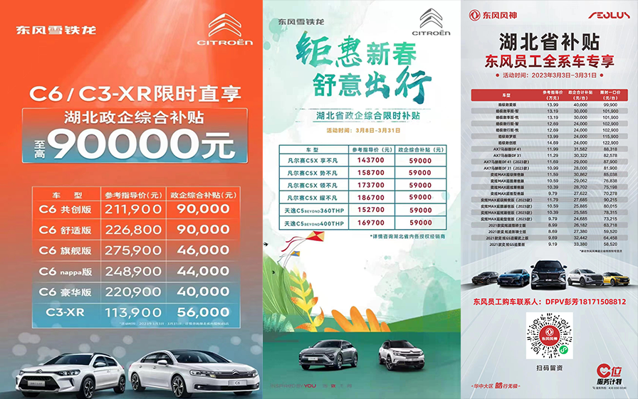 从政府层面,湖北省联合多家车企推出政企购车补贴,凡在湖北购买“东风系”车型,单车补贴金额最高达到9万元。