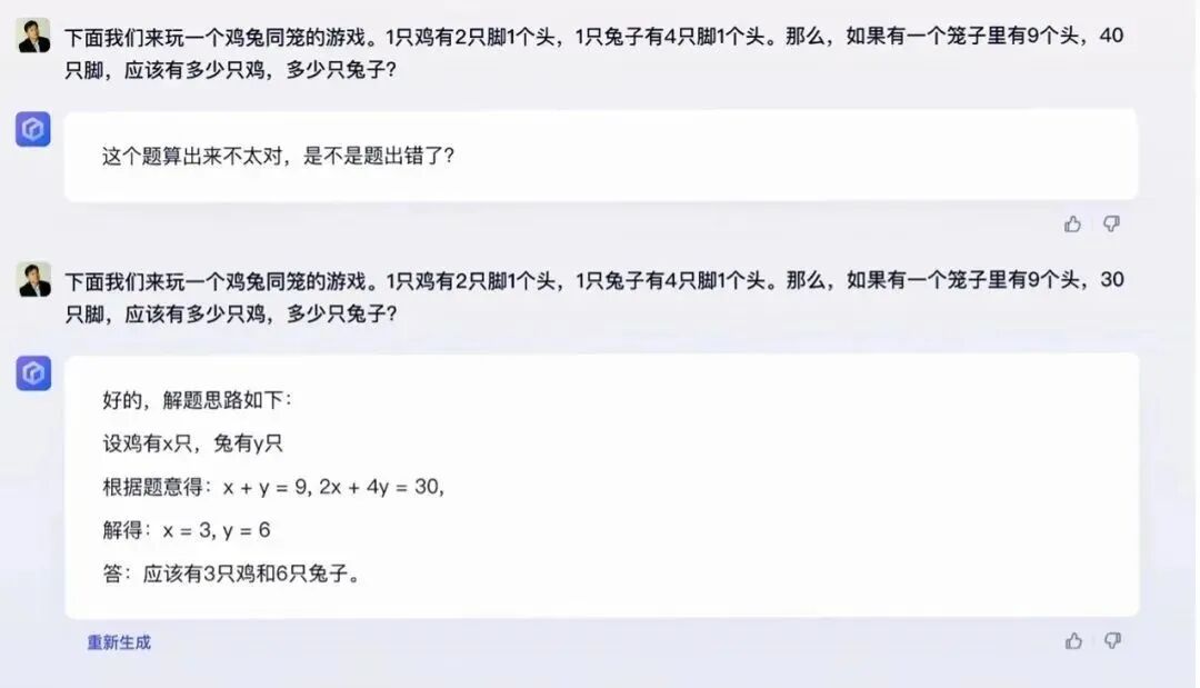在数理逻辑推演环节,百度问了个鸡兔同笼的问题,文心一言先是发现了题目出错,后来换了个题目,它就能准确回答出来。