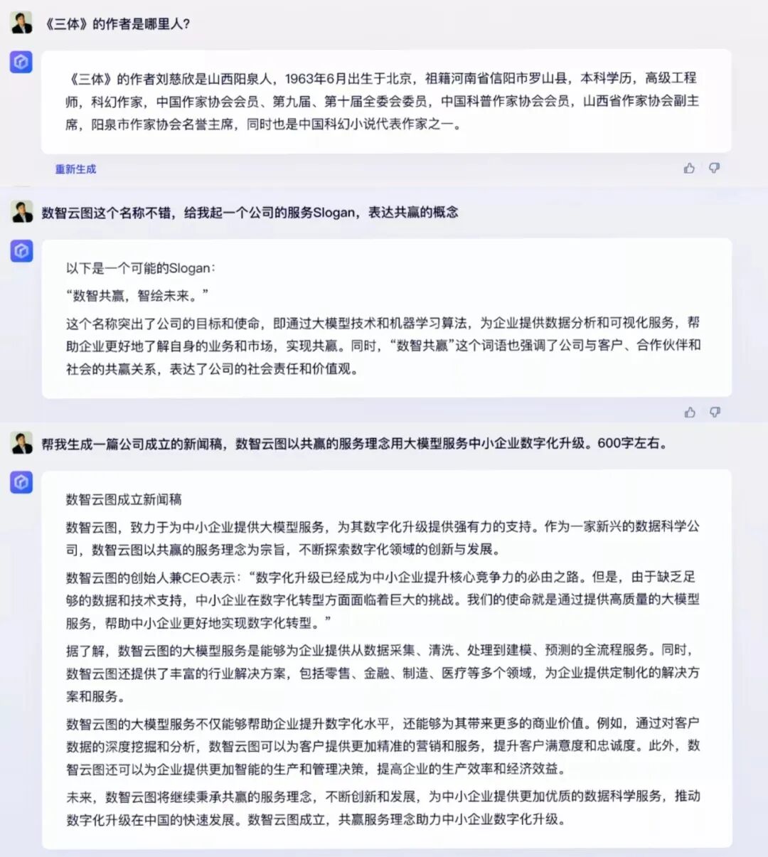 演示内容显示,文心一言可以准确回答《三体》作者,角色扮演者这些事实问题,也能完成写新闻稿、给公司起名等创作任务,还能生成方言音频、视频内容等等。