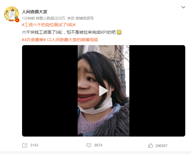 上述视频里应聘者愿意不厌其烦,参与6轮面试,接受公司的各种询问,她是对这份工作感兴趣的;