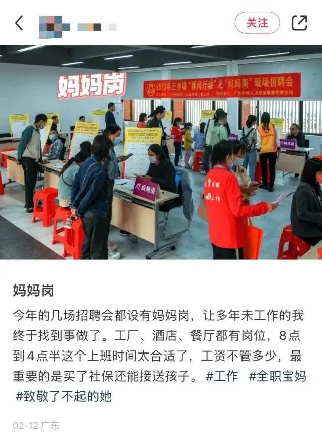 有网友称,自己在中山参加的多场招聘会上,都专门设置了“妈妈岗”:买社保,工作时间灵活,方便接送孩子。