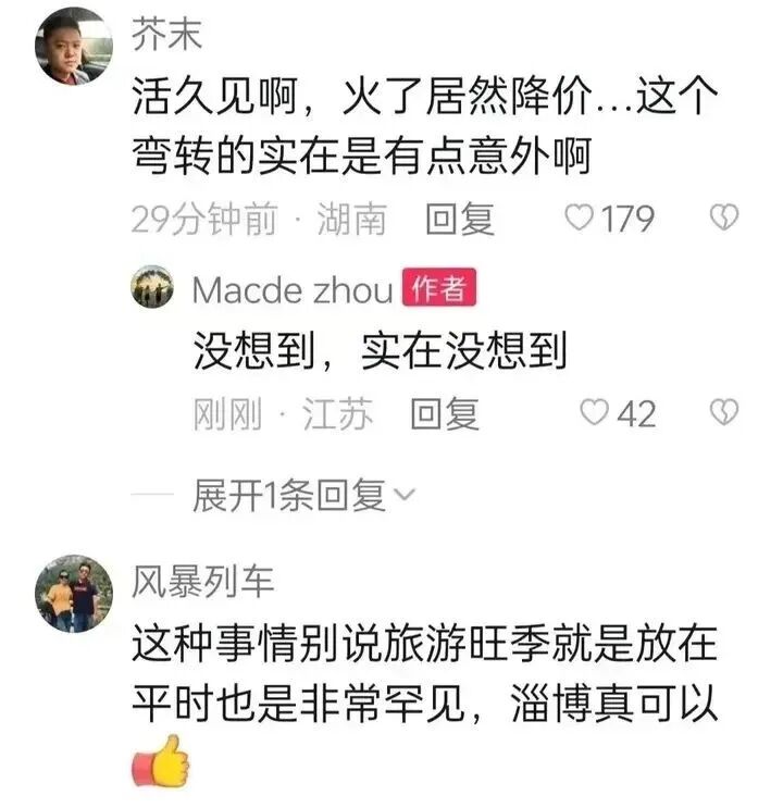 也有网友表示:淄博政府发明了“坐地降价”这个词,从来没听说过节假日不升反降的操作。