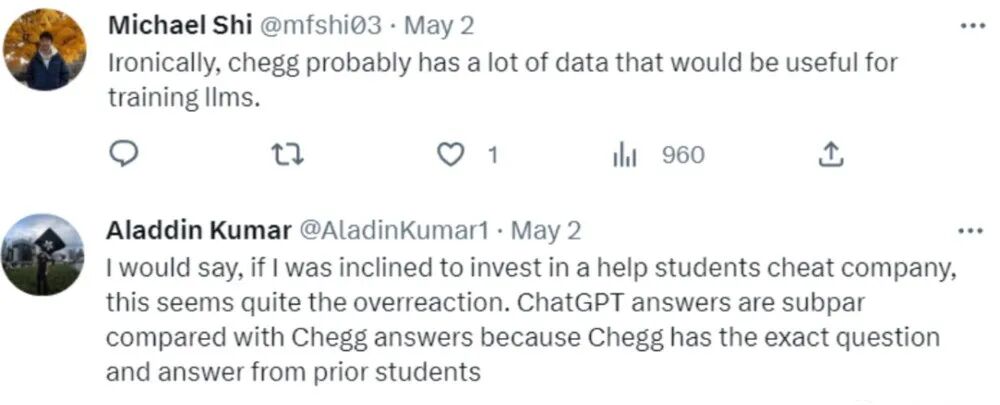 还有网友调侃,讽刺的是,像Chegg这样的公司,还拥有不少能用于训练LLM的数据“养料”,因为它有一个巨大的数据库,里面有很多标准问题答案: