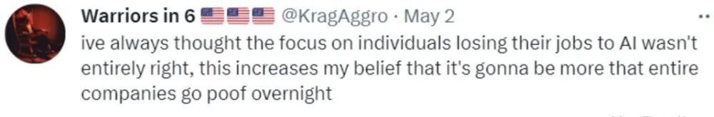 从这件事来看,有网友认为,AI“让人类失业”已经不准确了,更多的是“让整个公司在一夜之间消失”:
