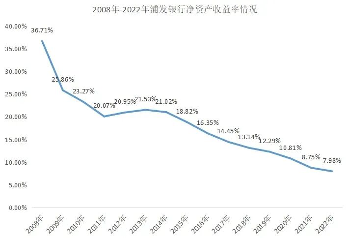 可以看到,2008年的时候,浦发银行的净资产收益率一度在30%以上;2014年前,这一数值依旧保持在20%以上;但是,2014年之后,便呈现逐年下降的趋势,由21.02%下降至7.98%。