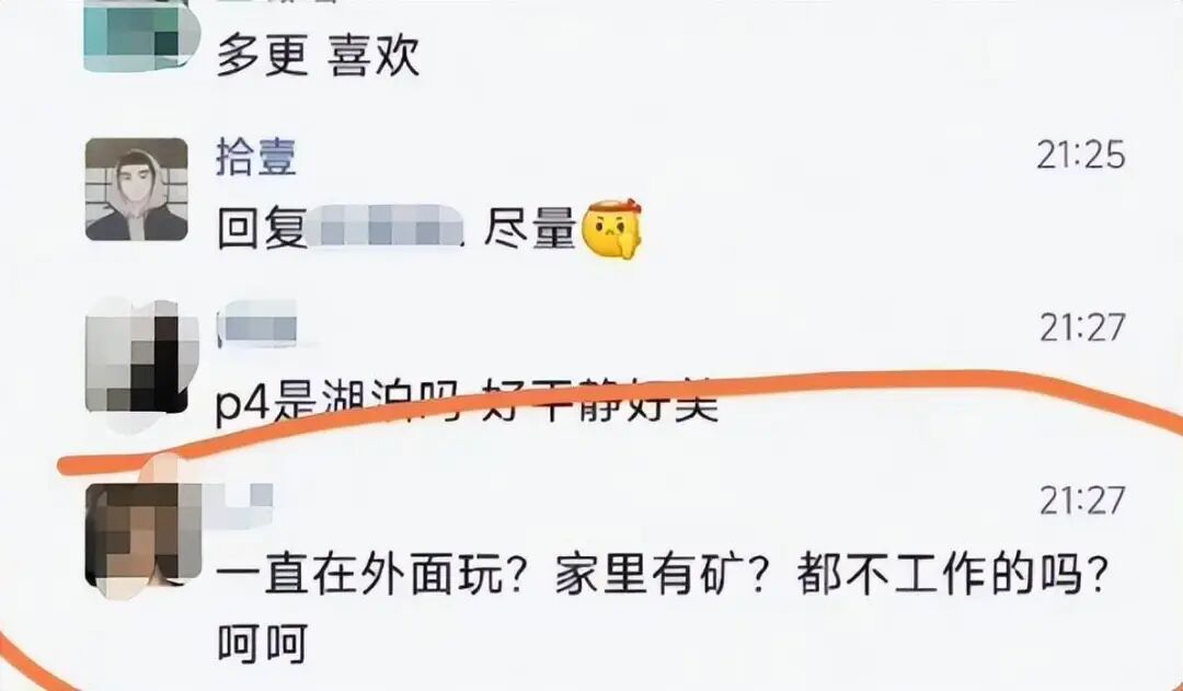 5月14日,一位微信好友在其发布的西藏动态下评论:“一直在外面玩?家里有矿?都不工作的吗?呵呵。”