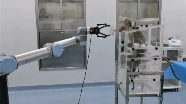 在这个实验中,科学家把一组电极植入到恒河猴的大脑皮层中,采集脑电信号,然后遥控并将其转化为控制信号,通过一个机械臂实现对物体的抓取和放置等操作。