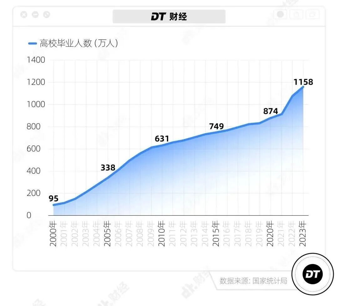 而今年夏天,据人力资源和社会保障部公布的数据,全国2023届高校毕业生,将达到1158万;在流行读书改变命运的2000年,这个数字还是95万。