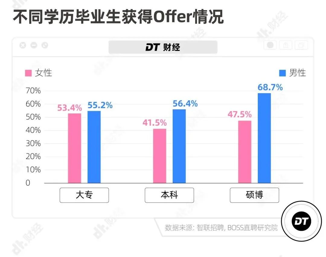 不仅不同学历的毕业生有着不同的处境,女性和男性的就业处境也有很大区别:智联招聘数据显示,到今年四月,男性获得offer的比例整体高于女性,学历越高,两者差值越大。