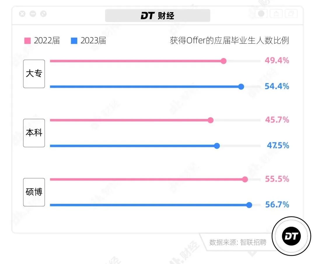智联招聘发布的《2023大学生就业力调查报告》显示,对不同学历的毕业生群体而言,困境的程度稍有不同,本科生的处境最为尴尬。