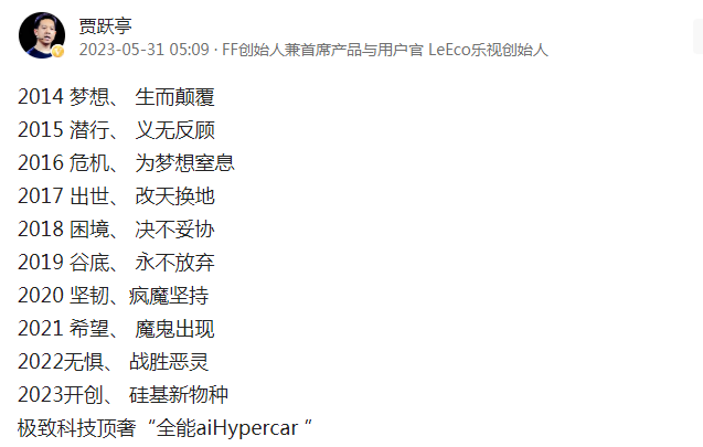 从2014年投资法拉第未来开始,贾跃亭从不吝于表达他对FF的期待和付出。