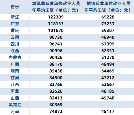 数据显示,15个省份中,城镇非私营单位就业人员年平均工资超过10万元大关的仅三个省份:浙江、广东、重庆。