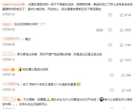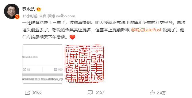 6月12日晚间,罗永浩在微博宣布将退出微博和所有社交平台,再次埋头创业。他表示一眨眼竟然快13年了,过得真快、想说的话其实挺多,但基本都跟杂志说完了。