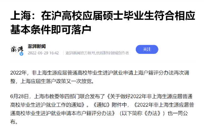 这不,前几天,上海放了个王炸,说是在达到一定级别的应届硕士毕业生,无需“打分”,符合基本条件就可直接落户。