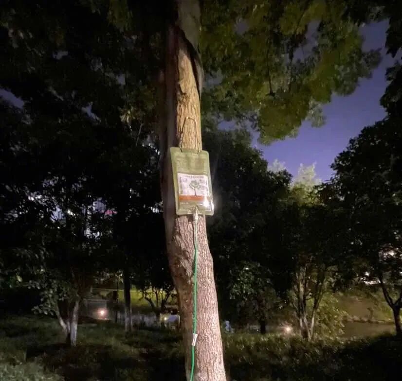 为避免植物备受“烤验”,杭州部分地区为树木挂上了类似“打点滴”的养护滴灌袋。