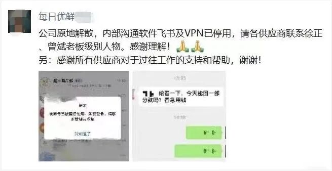 其实在今年三月,每日优鲜就已经开始大面积裁员,原本2000多人,剩下不足900人,供应商也经常登门讨债。